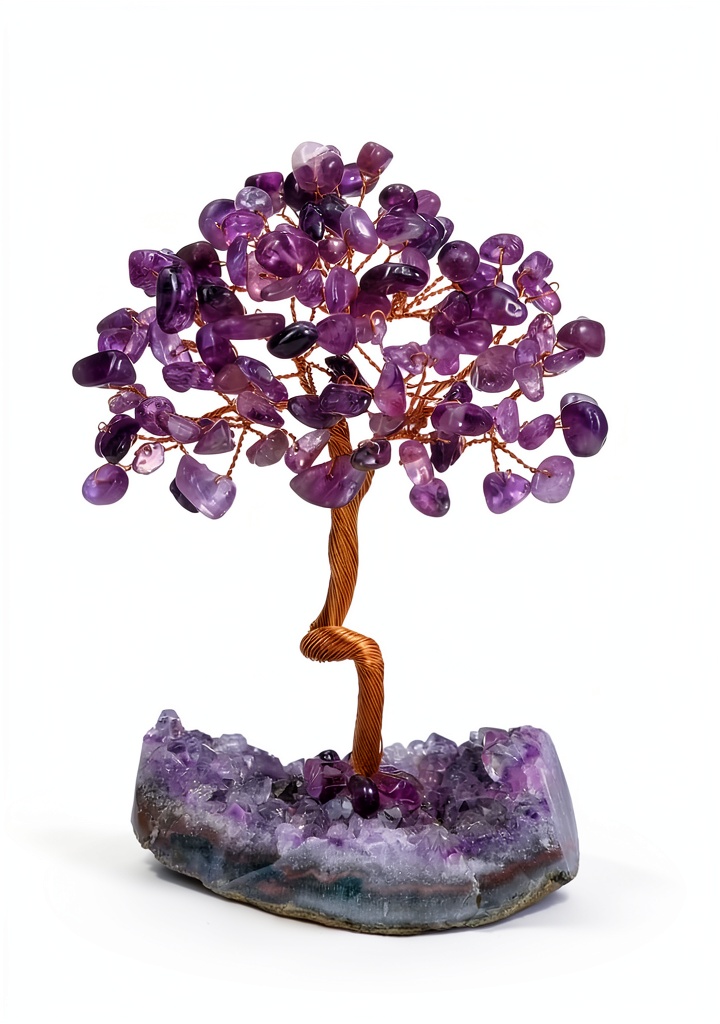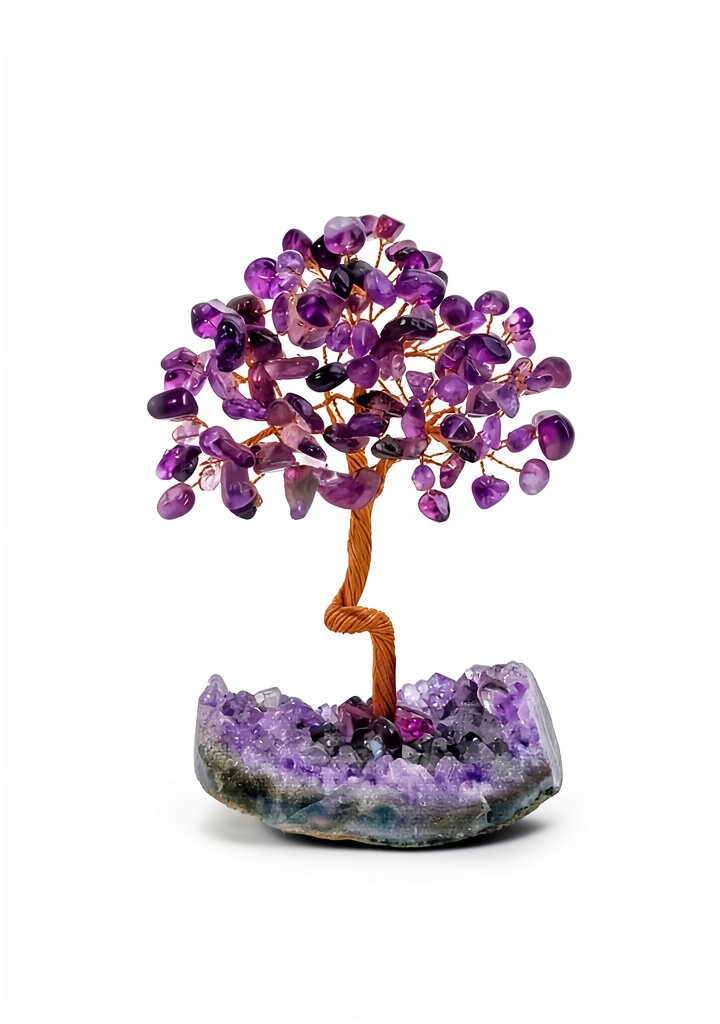 L’arbre de vie Jovivi est une création artisanale en pierre d’améthyste naturelle, mesurant entre 10 et 13 cm de hauteur. Monté sur un amas de cristal de roche, cet objet décoratif combine esthétisme et symbolique Feng Shui. Chaque pièce est unique, façonnée à la main en Inde, avec des variations naturelles qui en renforcent le caractère authentique. Le poids total est d’environ 220 grammes, et l’emballage comprend l’arbre porte-bonheur dans une boîte adaptée.