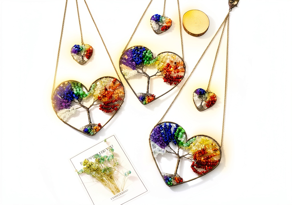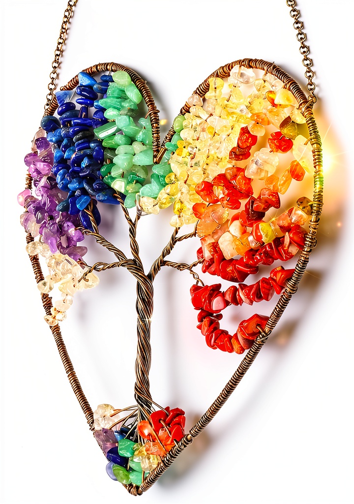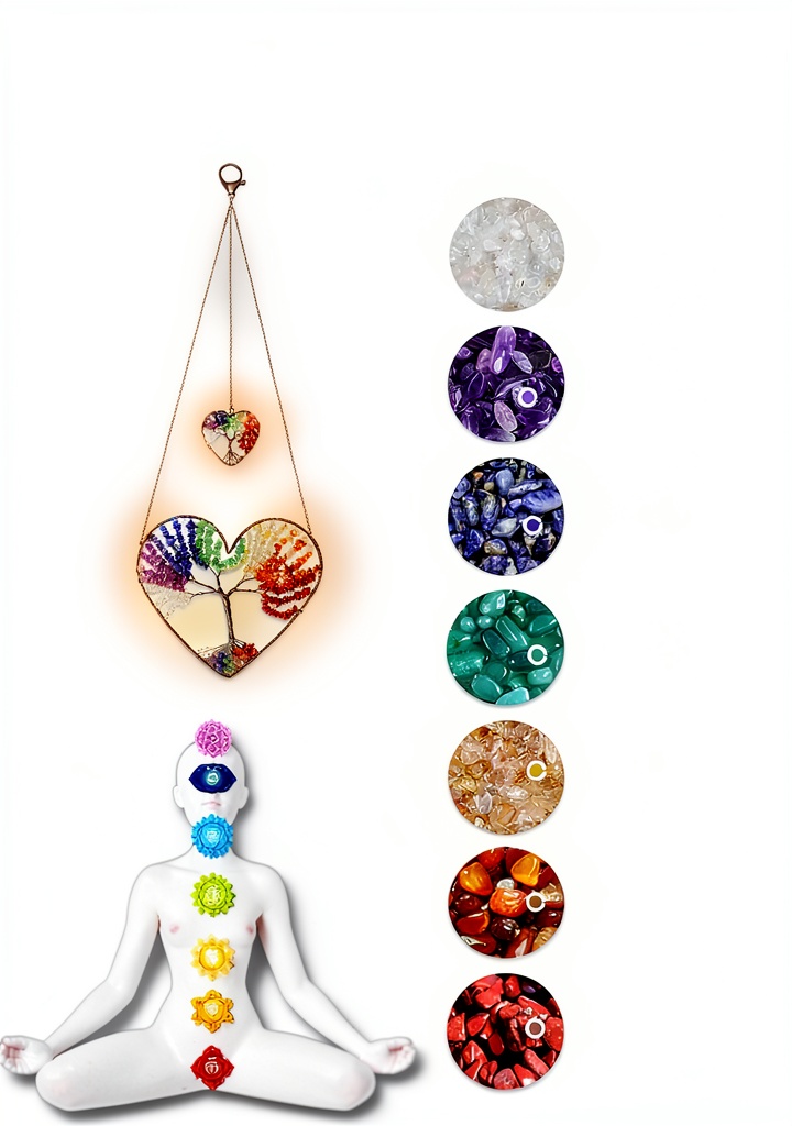 L’ornement comprend sept cristaux : quartz transparent pour la clarté, améthyste pour la tranquillité, sodalite pour la communication, aventurine verte pour la chance, citrine pour l’abondance, agate rouge pour la stabilité et jaspe rouge pour la vitalité. Ensemble, ils aident à équilibrer les chakras et à promouvoir un flux d’énergie positif.