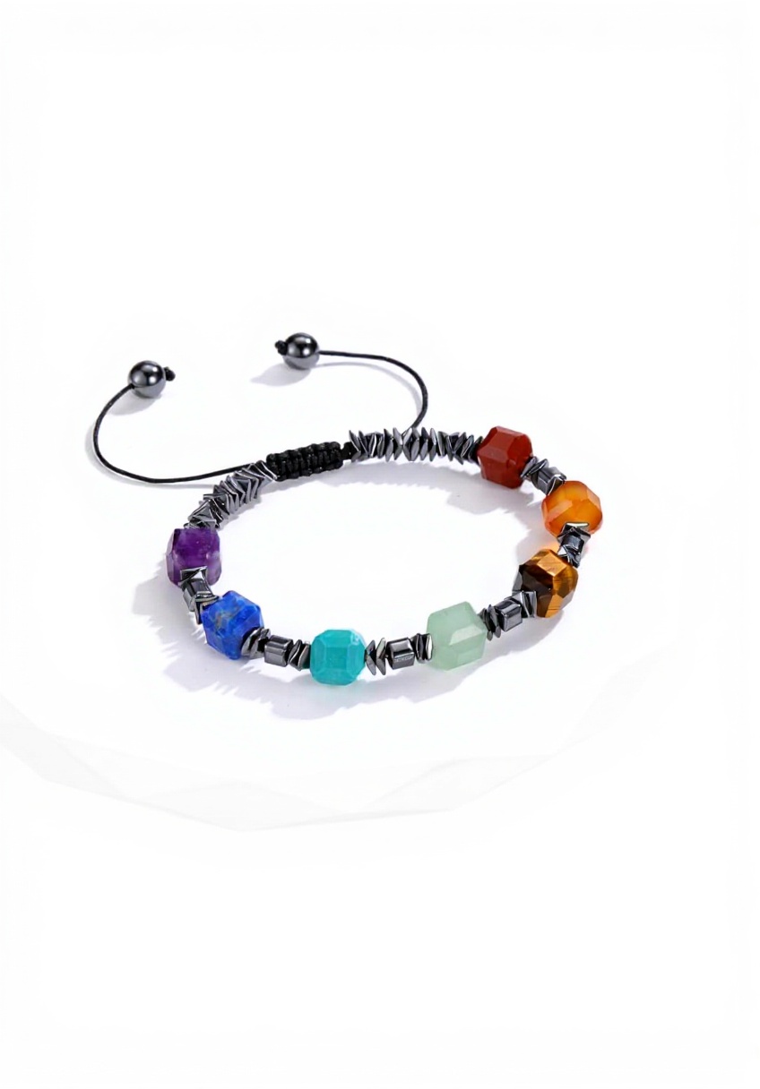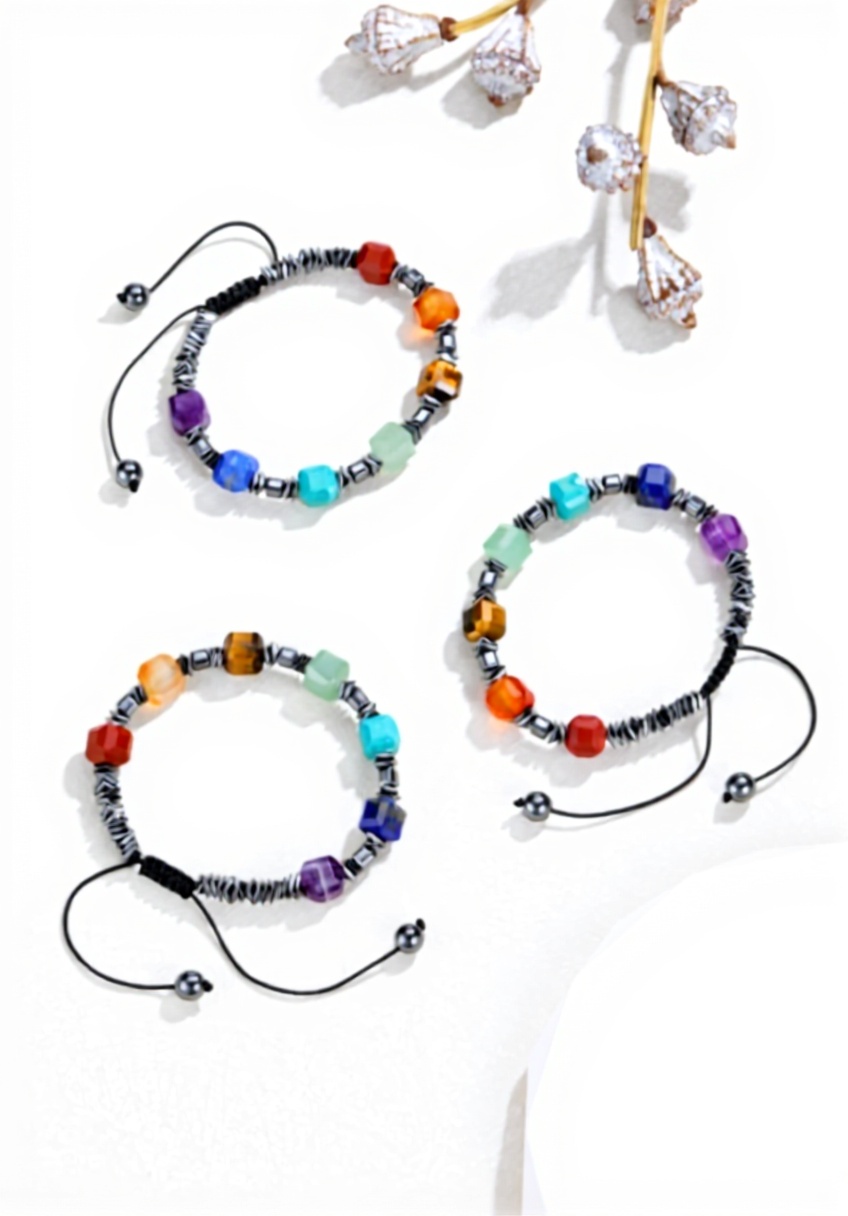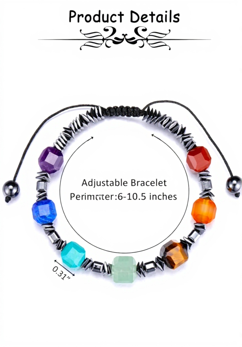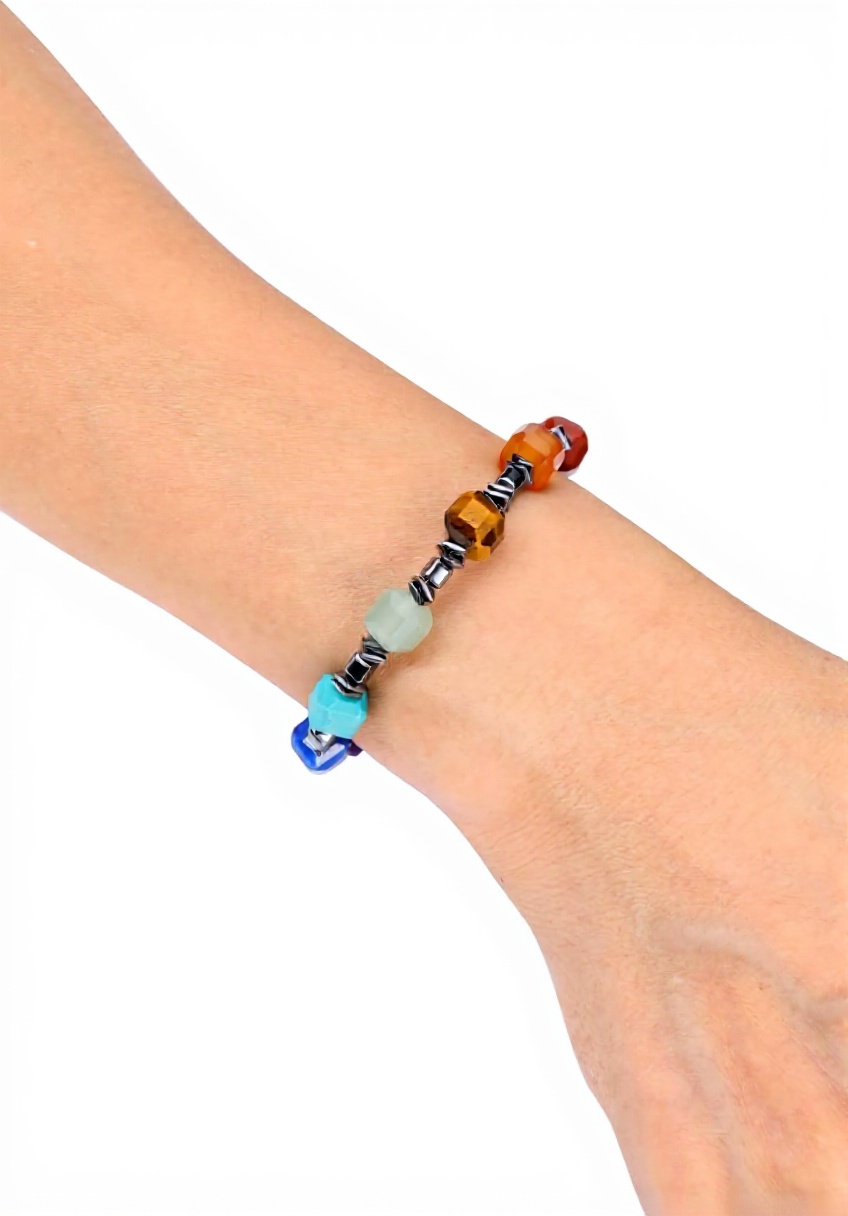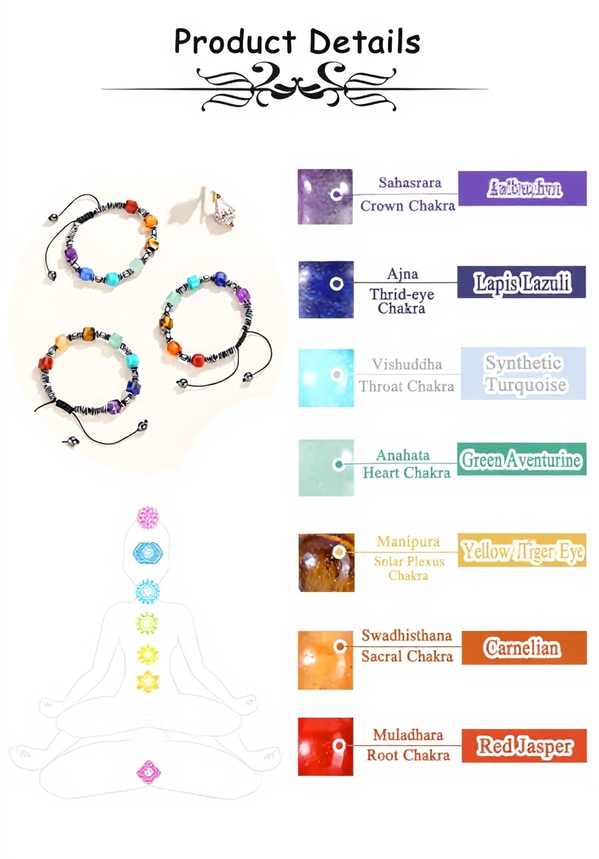 Le bracelet comprend sept pierres de chakra : pierre rouge, agate rouge, œil de tigre jaune, aventurine verte, pin vert synthétique, or lapis et améthyste, ainsi que de l’hématite pour la protection.