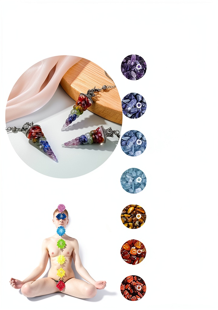 Il inclut jaspe rouge, cornaline, œil de tigre jaune, péridot, aigue-marine, lapis-lazuli et améthyste, chacune associée à un chakra spécifique.